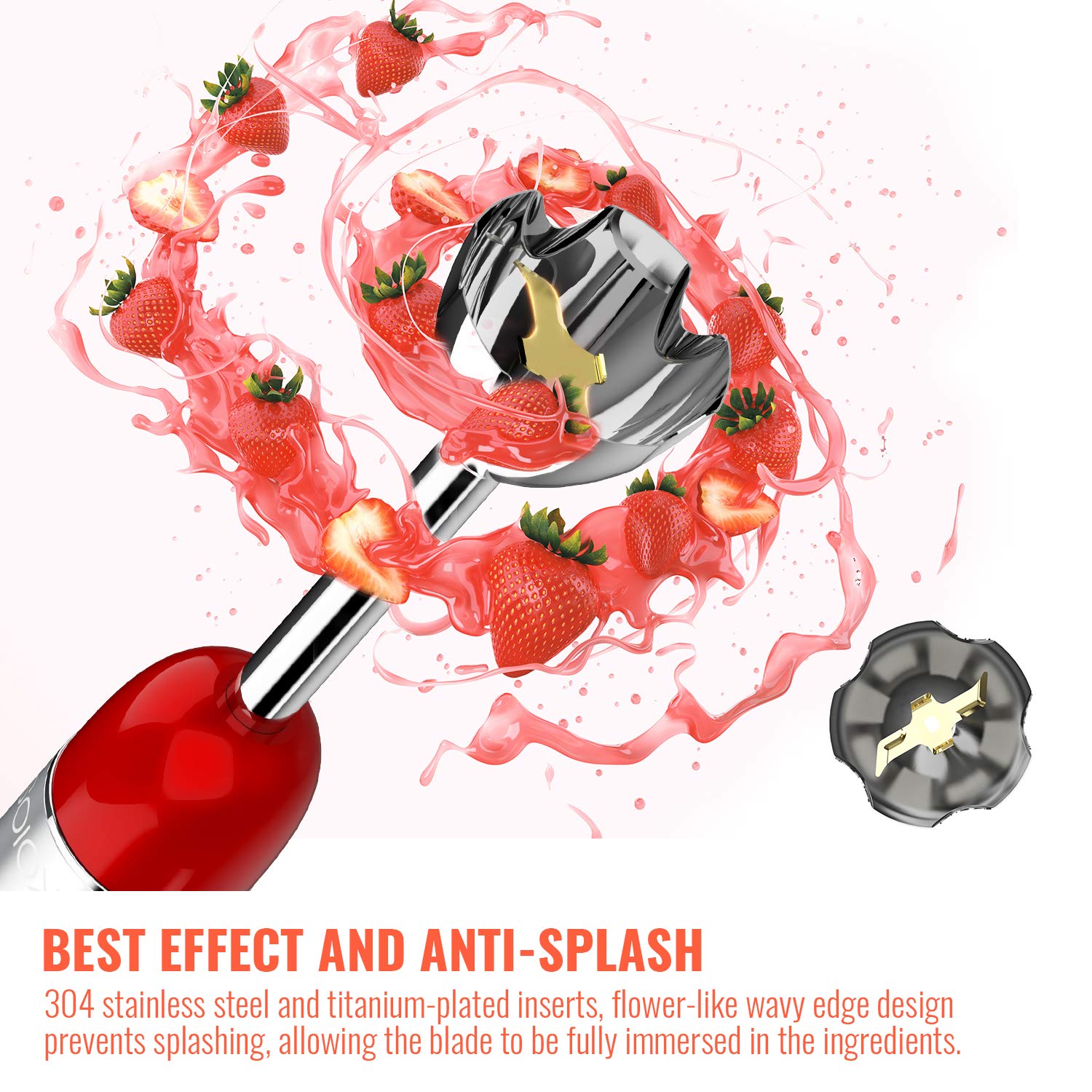 KOIOS 5-in-1 Hand Immersion Blender, 1000W 12 Speed Handheld Blender Stick with Copper Motor Stainless Steel Blade, 600ml Mixing Beaker,500ml Food Processor, Whisk, Milk Frother, Non-BPA, Red